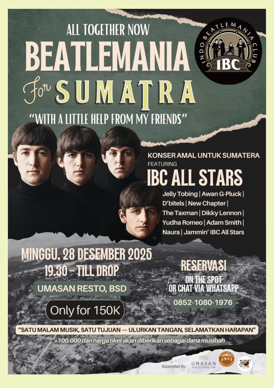Jakarta – Budayantara.tv Kepedulian terhadap saudara sebangsa yang tengah tertimpa bencana di Aceh, Sumatera Utara, dan Sumatera Barat diwujudkan melalui harmoni musik dan semangat solidaritas. Indo Beatlemania Club (IBC), payung besar komunitas penggemar, pecinta, dan penggila The Beatles di Indonesia, akan menggelar malam penggalangan dana bertajuk “Beatlemania For Sumatera, With A Little Help From My Friends.”