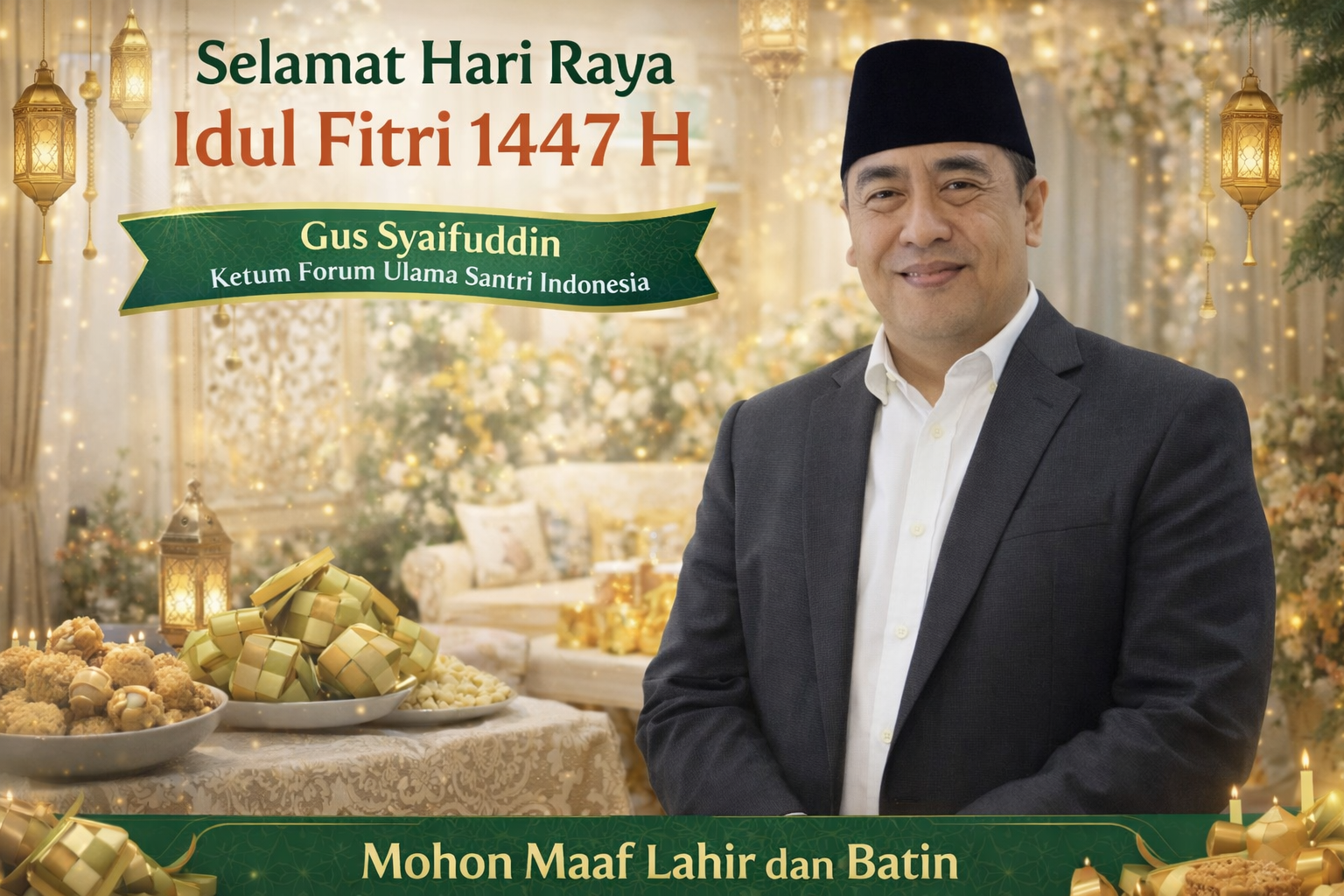 “Selamat Hari Raya Idul Fitri 1 Syawal 1447 H. Mohon maaf lahir dan batin. Taqabbalallahu minna wa minkum, taqabbal ya karim.”