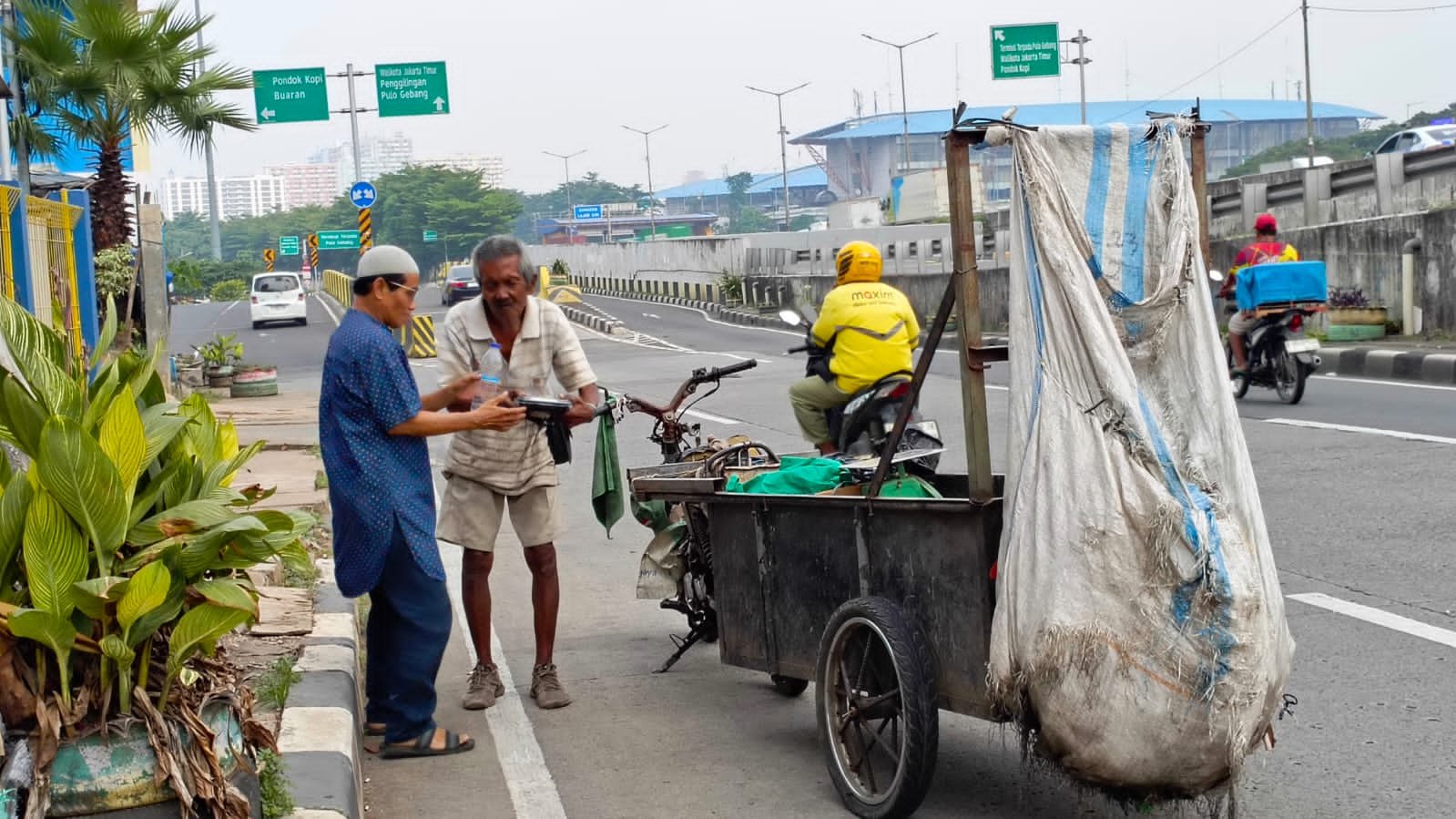 Setelahnya, berbagi ke Pak Daly pemulung barang bekas) yang ditemu di wilayah Harapan Baru, Kota Bekasi. Ada Pak Sukarta (PJLP) di Cakung. Juga Pak Suparman (kaum rentan), Pak Kiswanto (pemulung) serta Bang Fauzi dan kawan-kawan (Ojol) yang tengah istirahat di Flay Over Cakung, Jakarta Timur. JakTim